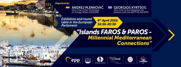 Zastupnik u EP-u Andrej Plenković će u suradnji s gradonačelnikom Staroga Grada Vinkom Maroevićem u ponedjeljak 4. travnja u Europskom parlamentu organizirati okrugli stol i izložbu »Otoci Faros & Paros: Milenijske mediteranske veze«, a povodom obilježavanja 2400 godina Staroga Grada na Hvaru. Riječ je o projektu kojeg Plenković realizira i u partnerstvu s grčkim zastupnikom u EP i potpredsjednikom delegacije EP-a za odnose s NATO-om Georgiosom Kyrtsosom.