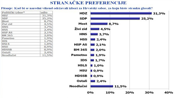 Najnovije istraživanje CRO Demoskop, provedeno od 1. do 3. prosinca, pokazuje da je treći mjesec zaredom HDZ u vrhu ljestvice političkih stranaka, sada prema izboru 31,3% ispitanika. SDP je na drugom mjestu s 25,2%. MOST nezavisnih lista treći je po redu s 8,7%, a potom slijede ostale političke stranke.