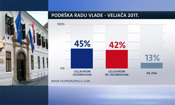 Vladin rad odobrava 45% ispitanika, ne odobrava ga 42%, dok je 13% neodlučno. To je promjena u odnosu na siječanj, kada je 42% ispitanika podupiralo rad Vlade, a 47% se nije slagalo s njim.