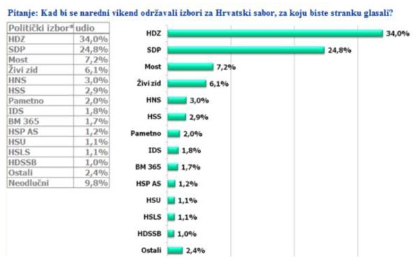 Na ljestvici stranaka vrh pripada HDZ-u po izboru 34% građana (prema 30,8% iz svibnja), dok je SDP na drugom mjestu s 24,8% (prema 24,1% iz svibnja). Na trećem je mjestu MOST sa 7,2% potpore (u svibnju 10,3%), a slijedi Živi zid sa 6,1% te ostale stranke.