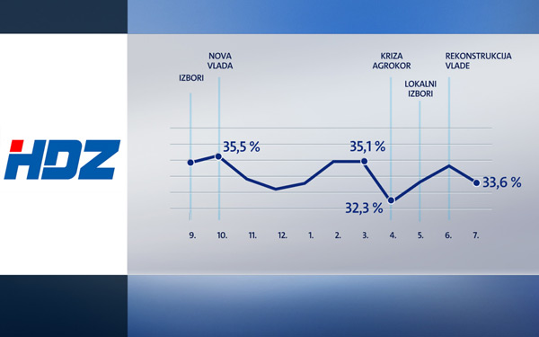 U srpnju je HDZ i dalje prvi izbor građana s potporom od 33,6 posto ( u lipnju 34,8 posto). Drugi je SDP s 22,4 posto (u lipnju 22,2 posto), a slijede Živi zid s 7,6 posto (u lipnju 7,3 posto), MOST s 6,2 posto (u lipnju 7,4 posto), Stranka rada i solidarnosti s 4,7 posto te ostale stranke.