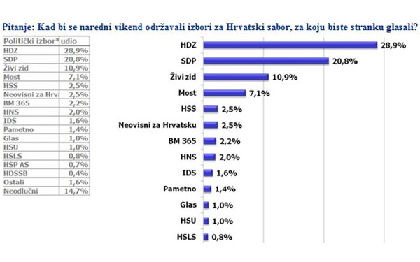 Prema istraživanju CRO Demoskop na vrhu ljestvice preferencija političkih stranaka u ožujku nalazi se HDZ s izborom od 28,9 posto ispitanika (prema 29,3 posto iz veljače). SDP je drugi i bilježi potporu od 20,8 posto (prema 21,1 iz veljače), a slijede Živi zid s izborom od 10,9 posto (prema 11,8 posto iz veljače) i MOST sa 7,1 posto (prema 6,1 posto iz veljače) te ostale stranke, a neodlučnih birača je 14,7 posto.