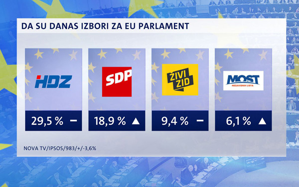 Prema istraživanju agencije IPSOS, da su danas izbori za Europski parlament, HDZ bi osvojio 29,5 posto potpore birača. SDP bi bio na drugom mjestu s 18,9 posto potpore birača, a treća opcija je Živi zid s 9,4 posto. Slijedi Most sa 6,1 posto, dok Amsterdamska koalicija trenutačno uživa 5,6 posto potpore birača. Neodlučnih birača 60 dana prije izbora je 5,8 posto.