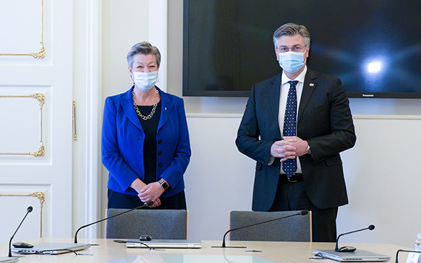 Predsjednik Vlade Andrej Plenković primio je povjerenicu Europske komisije za unutarnje poslove Ylvu Johansson, a sastanku je nazočio potpredsjednik Vlade i ministar unutarnjih poslova Davor Božinović