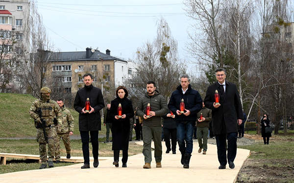 Premijer Plenković položio je vijenac pred Zidom sjećanja na poginule za Ukrajinu u Kijevu, a potom je, zajedno s ukrajinskim predsjednikom Zelenskim, moldovskom predsjednicom Sandu, slovačkim premijerom Hegerom i slovenskim premijerom Golobom, u Buči sudjelovao na komemoraciji za žrtve ruske agresije i odao počast herojima koji su dali svoje živote u obrani ukrajinske slobode i demokracije.