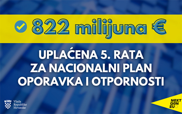 Hrvatska je iz europskog proračuna primila uplatu od 822 milijuna eura iz Mehanizma za oporavak i otpornost i time postala prva članica Europske unije kojoj je odobren zahtjev za isplatu pete rate