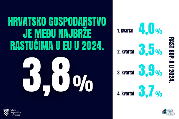 Naglasio je da je još važnije da hrvatsko gospodarstvo, kada gledamo cijelu 2024. godinu, bilježi rast od 3,8 posto što nas svrstava među dvije najbrže rastuće ekonomiju u EU. Jedina koja ima viši rast od Hrvatske je Malta.