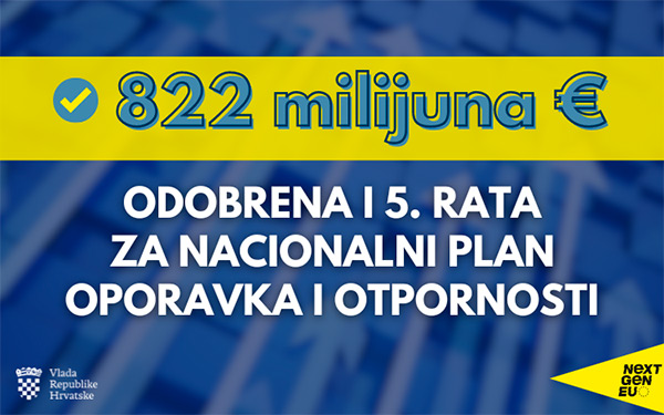 Europska komisija potvrdila je pozitivnu preliminarnu ocjenu petog, dosad najvećeg hrvatskog zahtjeva za plaćanje u iznosu od 821,7 milijuna eura iz Mehanizma za oporavak i otpornost