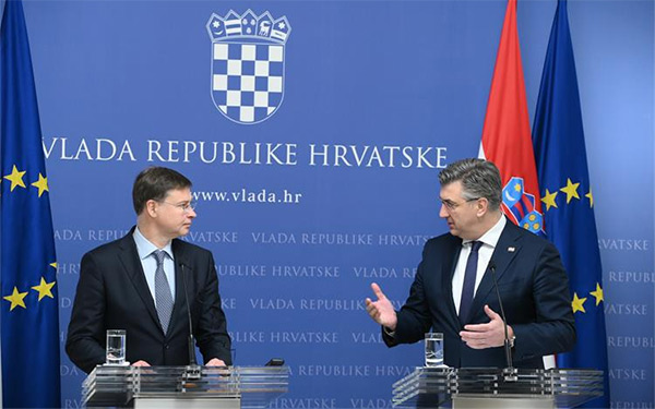 Premijer Andrej Plenković i potpredsjednik Europske komisije Valdis Dombrovskis razgovarali su o ulasku Hrvatske u europodručje te o trenutnoj gospodarskoj situaciji u Hrvatskoj i Europskoj uniji