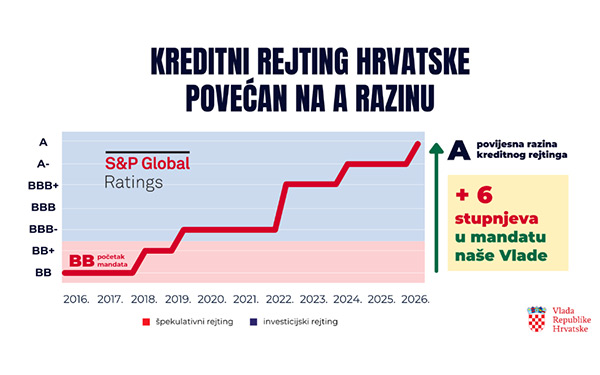 Agencija za dodjelu kreditnog rejtinga Standard & Poor's u svom je najnovijem izvješću podigla investicijski kreditni rejting Hrvatske s A- na razinu "A" za dugoročno zaduživanje uz stabilne izglede