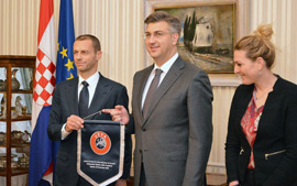 Predsjednik Vlade Plenković primio je u Banskim dvorima predsjednika UEFA-e Čeferina, s kojim je među ostalim razgovarao o suradnji nacionalnog nogometnog saveza s UEFA-om